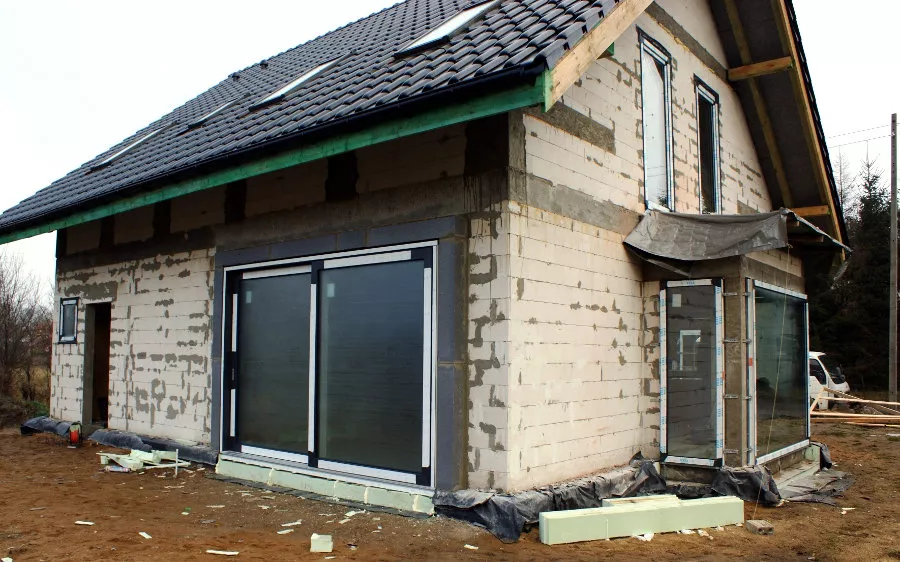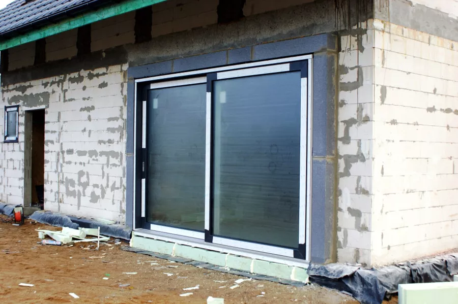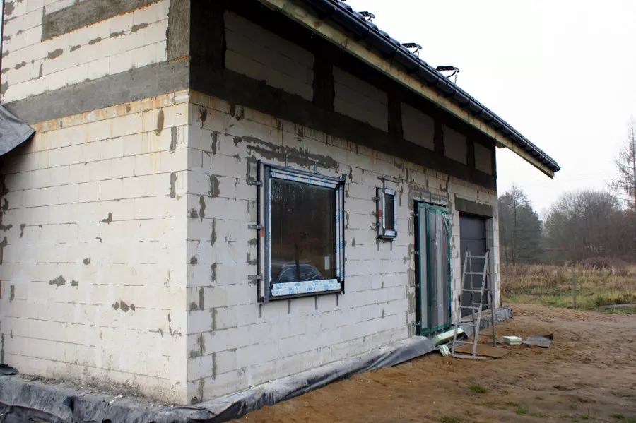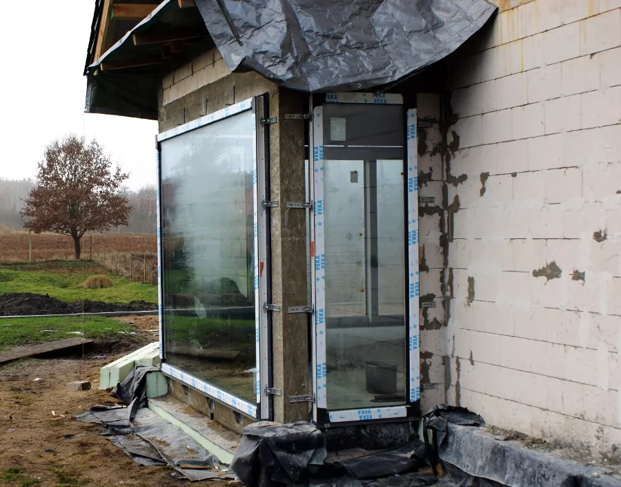 Wykonaliśmy montaż: dla drzwi oraz okien w tym okien na wykuszu, systemu HS i dwóch okien na ścianie głównej w warstwie ocieplenia przy użyciu konsol oraz taśm paroszczelnych i paroprzepuszczalnych wraz z wyklejeniem opasek ze styropianu grafitowego.